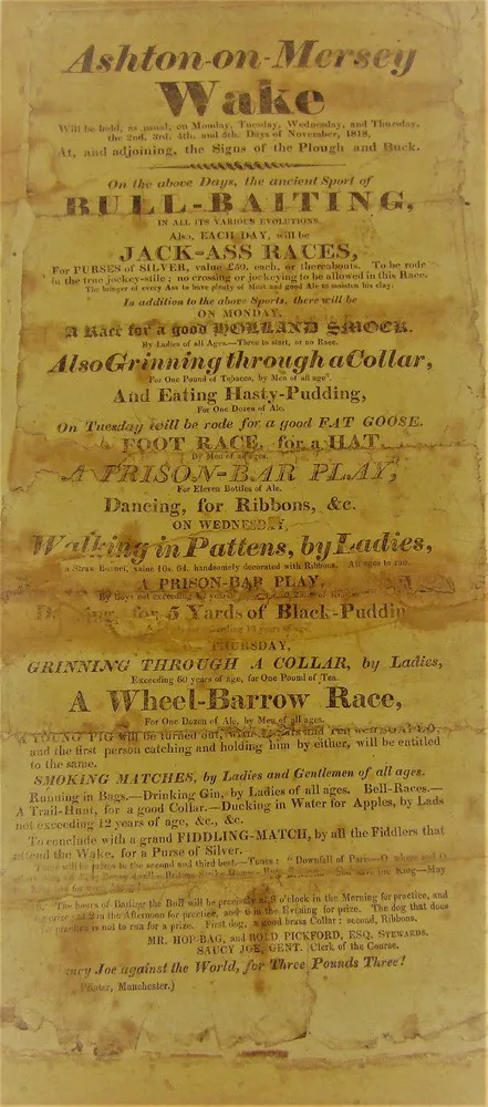 The annual Ashton-upon-Mersey wakes was a time of great excitement in the village, and people gathered from miles around to enjoy feasting, races, and games of strength and skill. Pedlars, hawkers and salesmen came from afar to sell their wares. As a rule, the wakes began with a service at St Martin’s Church, followed by a daily programme of entertainment, which took place in the area around the two village inns, the Buck and the Old Plough. Games such as ‘grinning through a horse collar’, ‘foot race for a hat’, ‘drinking gin for ladies of all ages’ and ‘walking in patterns by ladies’ were very popular, together with donkey racing, wheelbarrow races, sack races and apple bobbing. The barbaric ‘ancient sport’ of bull baiting attracted large audiences, and due to its popularity, was held every day throughout the festival.